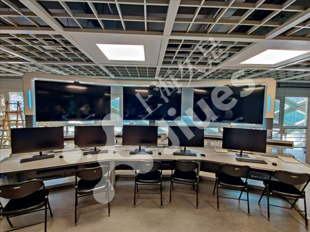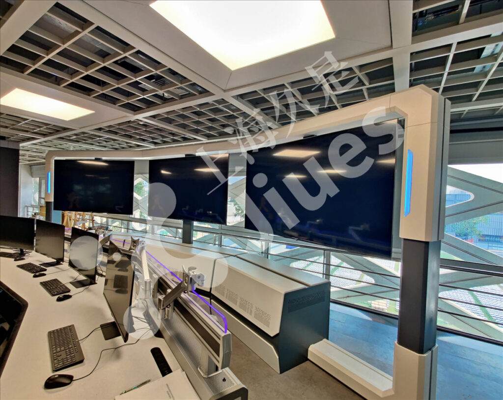 本产品适用于办公室控制台技术领域,并具有模块化后置显示系统,该模块化后置显示系统,包含外层框架,外层框架底部固定连接有主机机柜、中央支柱。